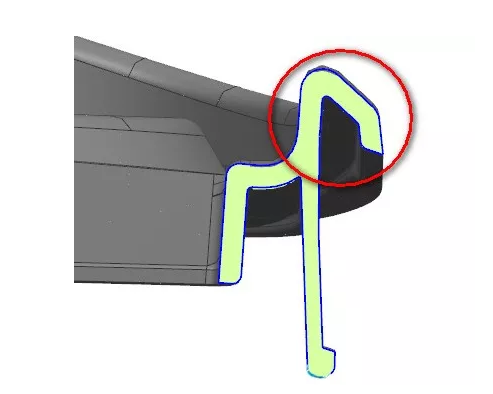 做普通滑塊機構抽出,紅色框的鋼料卡住無法出模,必須線將紅色框的鋼料先脫離產品再抽離倒扣。