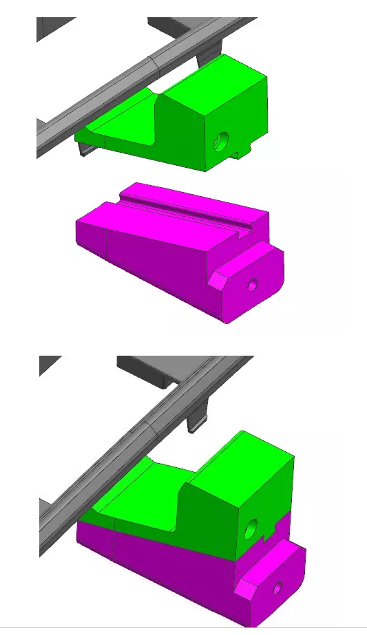 綠色為斜頂,帶突出的燕尾,品紅色為滑塊,主要是抽出倒扣和驅動斜頂向下脫扣,燕尾槽滑配。