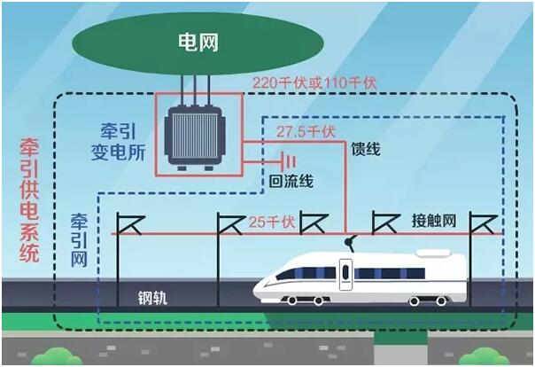 在我國電氣化鐵路中,使用的正是工頻(50赫茲)25(27.5)千伏單相交流電~這種單相、25(27.5)千伏的交流電是由牽引變電所將電網(wǎng)輸?shù)碾娹D(zhuǎn)變而來。