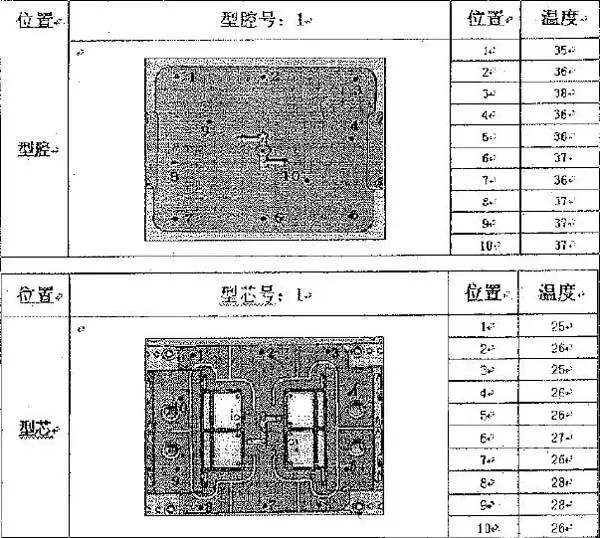用模溫測量儀測量型芯、型腔各選10個點的溫度,記錄在下表中;