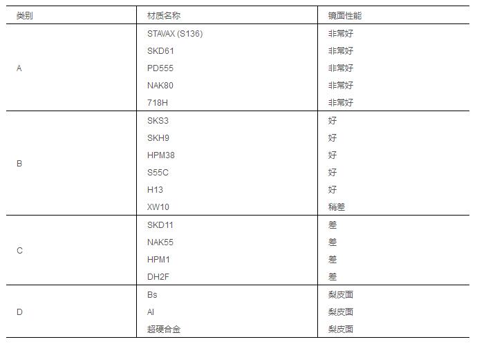 有些模具鋼材的電火花加工能容易達(dá)到鏡面效果,而有些模具鋼材無論如何也達(dá)不到鏡面效果。同時(shí),模具鋼材的硬度高些,電火花加工鏡面的效果更好。請(qǐng)參考下表各種材料與鏡面加工性能。