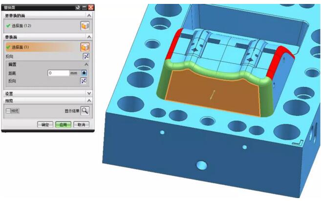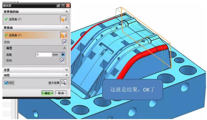 看到?jīng)],那里報警了,啥原因?替換的原理,是把我們選擇的目標面,做平我們指定的面,在這個過程中,它周圍相關的面必須要延伸或縮短,才能形成新的面,在這個過程中,由于公差,或者面的質(zhì)量,或者與旁邊的孔或其它特征有干涉直接難以成型時,就不能生成新的面了。至于到底是什么原因造成這個問題時,工作中,很難有這么多時間去研究清楚。我們一般是直接選其它方法來完成。